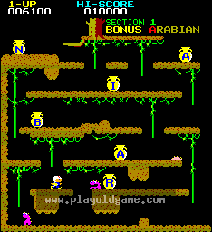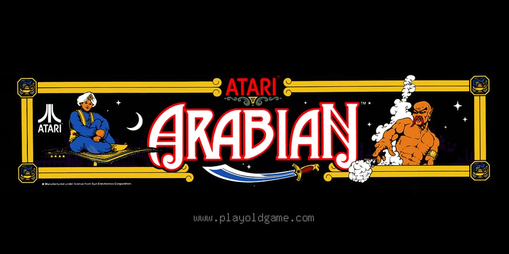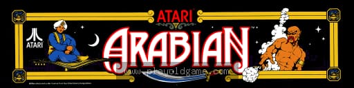 The player controls a young Arabian Prince who must rescue his Princess from the castle tower where she is being held prisoner. Evil Genies in brass jugs, swooping Rocs, and purple ghostly creatures called Oscars will try to stop him along the way. The Prince scores points for kicking Oscars or Rocs, picking up lettered jugs, or spelling A-R-A-B-I-A-N. The Prince loses a life when he's hit by a smokeball, falls off a ledge, flying carpet or vine, or gets caught (touched) by a Genie, Oscar, or Roc.
