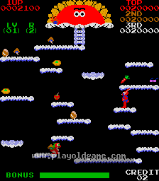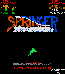 You are Springer the rabbit. You must jump from cloud to cloud, collecting everything you can, to reach the sun. You must jump from cloud to cloud and touch any items or eggs to collect them. If an egg hatches into a dragon, you can kick the dragon to collect him. There is a bonus timer that counts down on the screen so don't delay. Once you reach the sun at the top, then it is off to a more challenging screen.