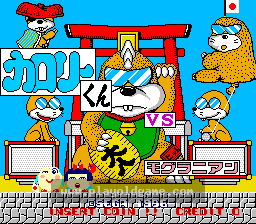 Calorie Kun vs Moguranian is a traditional platforms and ladders game in which the player controls an abstract, mole-like creature that must make its way around a number of underground tunnels, avoiding enemies and collecting the items placed around the screen; before quickly making its way to the exit. The player is armed with a limited number of bombs...