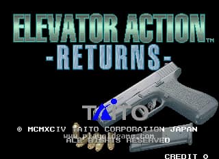 Elevator Action Returns is a scrolling platform shoot-em-up for one or two players who each take on the role of a special task force operative and must foil a terrorist group that has planted nuclear bombs in various facilities. Players must also obtain the secret intelligence data scattered throughout each facility in order to disarm the bombs.