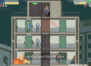 The objective of the game is to enter all of the red-coloured doors in each stage, then proceed to the exit. If players miss one of the red doors, they will be unable to progress beyond a certain point. There are also blue-coloured doors and entering these will award the player a special item, these include health refills, special firearms, sub-weapons and bonus points.