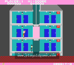 Agent 17 (code name 'Otto') is to secure the top secret documents from the security building. The enemy spies are in pursuit and their orders are to stop him at any cost. Having made it to the top of a 30 story building, Agent 17 has to make his way down to the basement to get to the getaway car and save the documents. Enemy spies are everywhere and the documents are hidden behind the red doors (bonus points awarded). He has to open the door and keep moving. If either of them shoots the lights out there will be a temporary blackout. If Otto finds himself on top of the elevator the player will not be able to control the elevator. If he gets caught in the elevator he is a sitting duck and cannot duck the bullets. By using the escalator he can reach the basement quicker. Otto can defeat his enemy by jump kicking or firing at them. Help Otto to grab all the documents and escape the spies.