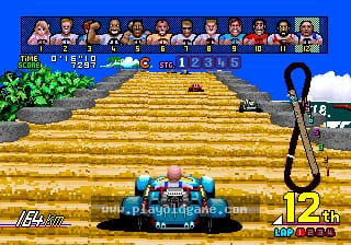 Power Drift is a fast-moving lap-based racing game in which players choose to race on one of five different circuits, each made up of five stages. The game's tracks have a 'roller-coaster' feel to them, with steep climbs, sudden drops and tight chicanes. It's also possible to fall from many of the higher, raised sections of a track, sending the car crashing to the ground below and losing valuable seconds. Each race takes place over four laps and players must finish in 3rd place or better to progress to the next stage. Finishing lower than third place results in a 'game over' but players can insert more credits to continue from the current stage.