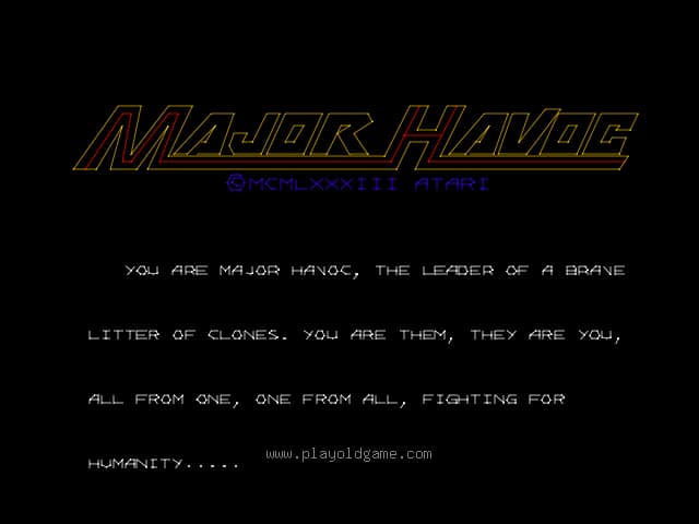 Major Havoc is a vector-based shoot-em-up and platform game in which the evil Vaxxian Empire overran the galaxy many years ago. Most of humanity was enslaved and abducted to the Vaxxian home world, although a few human scientists managed to escape. The Vaxxian Empire has long since collapsed but numerous Vaxxian space stations, all blindly controlled and defended by robots, still remain in the galaxy, mindlessly following their original, pre-programmed orders.