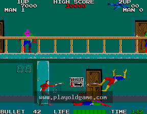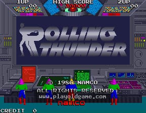 Rolling Thunder is a single-player scrolling platform shoot-em-up in which a James Bond-esque secret agent codenamed 'Albatross' has been ordered by the Rolling Thunder anti-espionage unit to stop the criminal organization known as Geldra. Albatross must also rescue captured field agent, Lelia Blitz and overthrow Geldra's leader, Maboo.