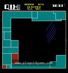 The objective of Qix is to claim a certain proportion of the playing field as your own. At the start of each level, the playing field is just a large, empty rectangle, containing the Qix - a stick-like entity that performs peculiar, erratic motions within the confines of the rectangle. The player controls a small marker that can move around the edges of the rectangle. To claim an area of the screen, the player must detach from an edge and draw Stix within the rectangle. Stix are simply lines traced out by moving the marker. When the marker traces out a closed shape, the area enclosed by the shape becomes solid and has been claimed. The player may draw either Fast Stix, which appear blue when solid, or Slow Stix, which appear red. Slow Stix take longer to draw, but are worth twice as many points. Once the player has claimed an area, the marker can safely move along the border of that claimed area. To complete a level, the player must claim 75% or more of the rectangle's area.