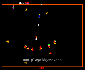 MAN, WOMAN, CHILD: These are the only three types of human clones left on Earth. Defenseless and easy prey to the Robots, they are totally dependent upon players for their survival and will wander aimlessly until the player makes contact with them. Touching them will place them under the player's protective powers and earn them the following points: 1,000 for rescuing the 1st human; 2,000 for the 2nd: 3,000 for the 3rd; 4,000 for the 4th; 5,000 for the 5th; and 5,000 for every additional human saved. At the beginning of each new wave and when the player loses a turn, rescue scoring will again begin at 1,000.
