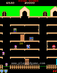 You control Mappy a police-mouse whose job is to collect valuables (consumer electronics)from a cat's house. You are being pursued by a gang of five pink cats. Doors are your only defense against the cats. You get from floor to floor by jumping on one of the trampolines.