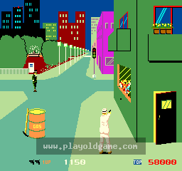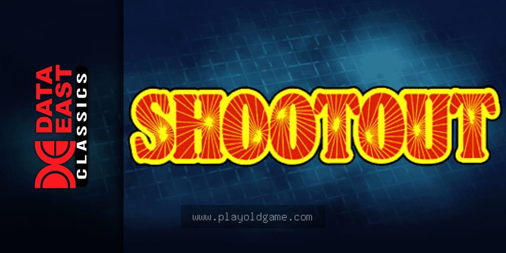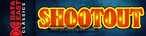 Shootout is a shooting gallery-style arcade game with a mafia theme. The player must make their way through eight stages before they can take on the boss. In taking down the crowds of bad guys, caution must be exercised in not hitting innocent bystanders. Movement and aiming is handled with the 8-way joystick. And unlike games such as Taito's Operation Wolf, you directly control your player instead of just an aiming reticle. Button one is used for shooting while the second button is used to perform an evasive roll to dodge enemy fire and other hazards. An alternating 2-player mode is also available.