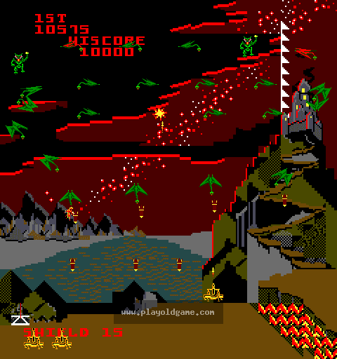 The attackers and the Devil's Head will try to wipe out your Rocket Launcher. If they do, you lose one player. In emergencies, you have a Shield which goes all around your Rocket Launcher for a short period of time. It is activated by pushing the Shield button on the control console. BUT BE CAREFUL!! This consumes a lot of power and will only last a VERY SHORT TIME!