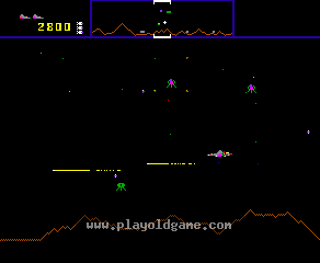 A long-range scanner at the top of the screen shows the positions of both the humanoids and the attacking aliens. The ideal strategy is to shoot down the alien ships before they reach the humanoids. If a humanoid is captured, the alien abductor can still be destroyed, but the player must then catch the falling humanoid and return it to the safety of the planet's surface before it falls to its death.
