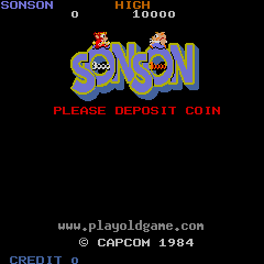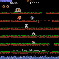 《Son Son》是一款二维横向卷轴平台游戏。屏幕会自动滚动,仅在对抗主要敌人时才会停止。屏幕上有六个平台,平台之间偶尔会有小间隙。Sonson 和 Tonton 会自动在这些平台上行走。按上或下会使他们跳到上一个或下一个平台。按左则会使他们移动速度比屏幕滚动慢,按右则会更快。两人只有一种攻击方式——用手杖发射能量弹。触碰到敌人或敌方飞行物会让玩家失去一条生命。如果玩家还有额外生命,他们会骑着一朵云回到屏幕上,并获得短暂的无敌状态。如果玩家按任意方向操作杆,云朵会消失,角色将恢复正常行走模式。