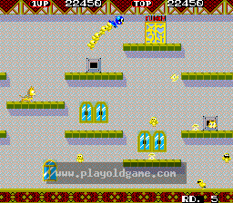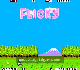 Flicky is a side-scrolling platform game in which the player controls 'Flicky', a flightless bird who must collect her lost chicks - called 'chirps' - and guide them safely to the exit, represented as a door with Flicky's name shown above it.