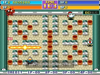 Bomber Man World is a strategic maze-based action game for up to four players in which the aim is to plant bombs to kill all of the enemies on the stage. Each of the game's grid-based stages are littered with both destructible and indestructible blocks, destructible blocks can be blown up to clear a path as well as to reveal a variety of different power-ups.