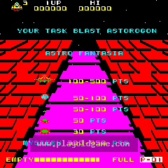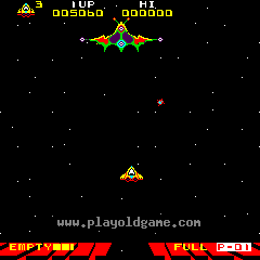 游戏以一个大型母舰在屏幕顶部可见开始,但此时你的射击无法击中它。红色UFO迅速开始攻击你,从屏幕顶部区域以线型编队俯冲下来。随着它们接近你,它们的体型实际上会放大(对于1981年的光栅游戏来说,这是一个很棒的效果)。通过移动,你会发现屏幕可以向上滚动相当多,如果你靠近区域顶部,敌军舰队将进入视野。...