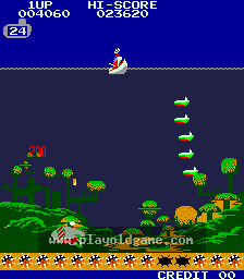 Good little shooter with a twist. You are dropping (very fast) depthcharges into the sea below, attacking waves of submarines and other underwater craft who are sending up mines as well as surface-breaking missiles.