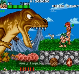 Joe and Mac must battle through numerous prehistorically-themed stages, fighting enemy cavemen and marauding dinosaurs. The heroes are initially armed with throwing axes that can be tossed either vertically or horizontally, travelling in a short arc. By holding down the attack button, larger, more powerful weapons will be thrown. When close to an enemy, Joe and Mac will utilise a wooden club to whack them. Players can also jump much higher by holding UP and JUMP.
