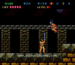 This game has you fighting monsters through seven stages with just a sword, but three other weapons can be picked up along the way, and include axes, chain spears, and smart bombs. These weapons can only be obtained by collecting the power-up that a defeated enemy leaves behind. Weapons can be switched along the way. At the end of each level, you must defeat a huge boss in order to go to the next stage.