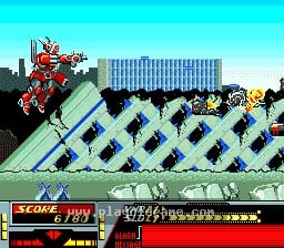For 3 years, alien invaders have been pounding the earth into a smoldering ruin. There isn't a man alive who can stop them. But now there's Veigues, a devastating fighting machine! Built with captured enemy technology, he's our last desperate hope for survival... and you're in control! Trash the invaders with the Plazma Cannon! Just keep your firepower hot and fight like there's no tomorrow. Destroy the aliens or there won't be!