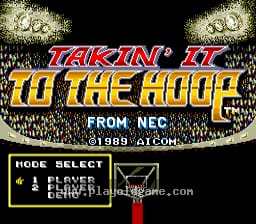 Takin' it to the Hoop is a basketball game with comic graphics. The player either participates in a league, play-offs or a single match and chooses one of eight American teams with twelve athletes. The team's performance during a match does not only depend on the player's ability but also on the athlethe's statistics (e.g. agility or dribbling) and their energy. Energy decreases during the course of a match and describes how much power an athlete has left. There are also three different defense tactics (one-on-one defense, zone defense or a mix between the two) which can be set before the match or during interceptions.
