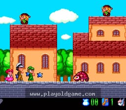 The three characters are based on characters of the series and change depending on the level. The health pool is shared between all characters and losing all hearts results in losing a life. Hearts can be refilled by collecting money which is left behind by killed enemies.