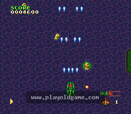 Cyber-Core is a vertically scrolling shooter in which the player fights insects. The basic idea is traditional: shooting everything before they can shoot/touch the player: after three hits the chitin armor breaks and a life is lost. Besides flying enemies which are disposed of with the standard gun, the player also has to deal with enemies on the ground...